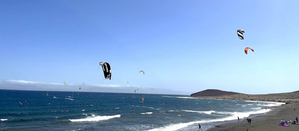 Kiteboarders and windsurfers in Tenerife. (Emily Louina Cook)